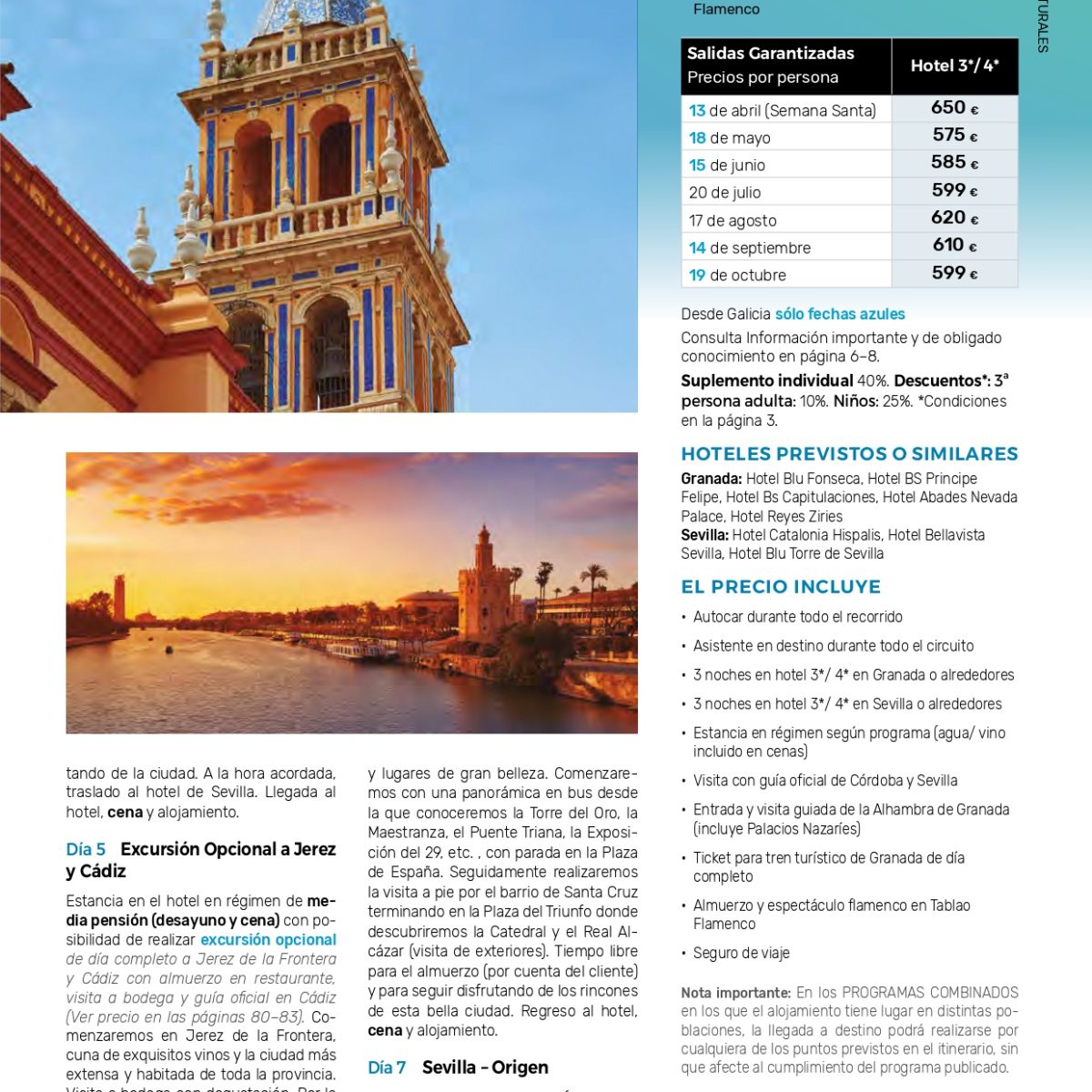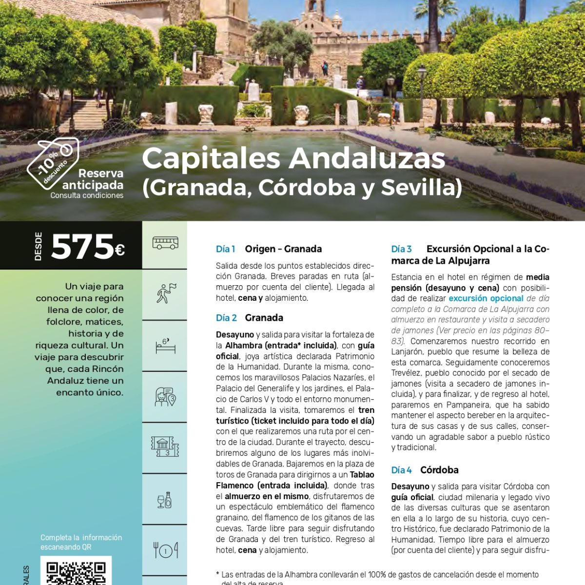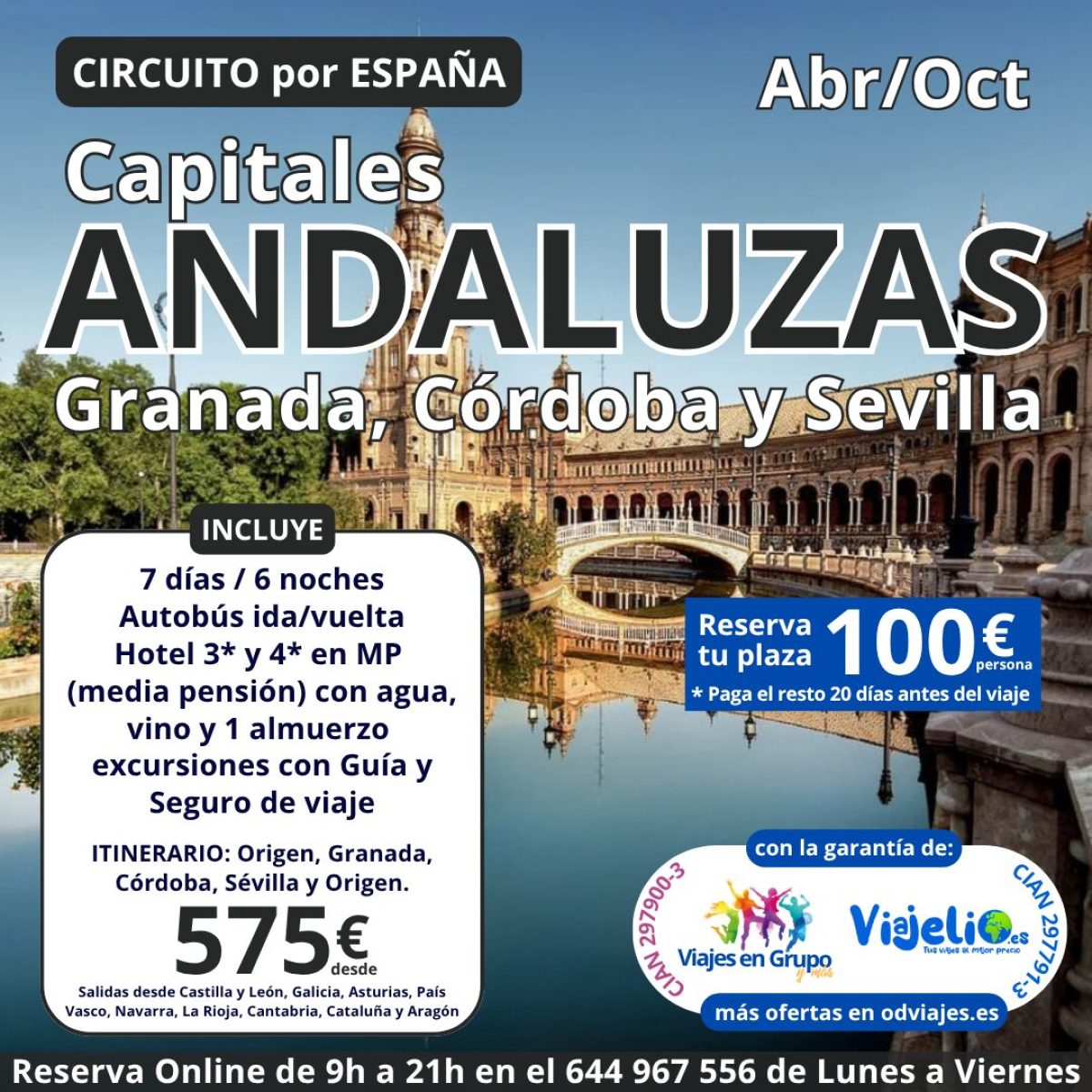 CAPITALES ANDALUZAS 💃🏻 de Abr/Oct, 7 días/6 noches. Incluye: 🚌 Autobús 🚌, Hotel 🏨 3* y 4* en MP (Media Pensión) agua y vino 🍷, 1 almuerzo, excursiones 🌇 con guía local 🙅♀️ y seguro de viaje. Precio desde 💶 575€/persona. Salidas desde Castilla y León, Galicia, Asturias, País Vasco, Navarra, La Rioja, Cantabria, Cataluña y Aragón.
