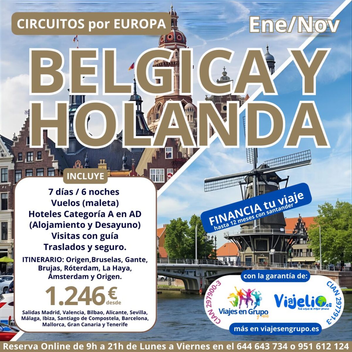 Bélgica y Holanda de Ene/Nov (7 días/6 noches) desde Madrid, Valencia, Bilbao, Alicante, Sevilla, Málaga, Ibiza, Santiago de Compostela, Barcelona, Mallorca, Gran Canaria y Tenerife. Incluye: Vuelo (maleta)🧳, Hoteles Categoría A en AD 🏨 (Alojamiento y Desayuno🥐), Visitas a Bruselas🇧🇪, Gante, Brujas🏰, Róterdam, La Haya y Ámsterdam🌷, Traslados🚐 y Seguro🛡️. Precio desde 1.246€💥