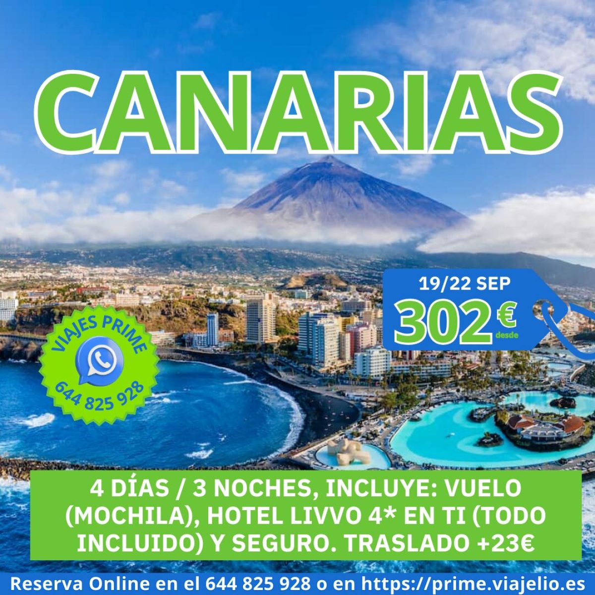 CANARIAS del 19/22 de Septiembre (4 días/ 3 noches) desde Málaga. Incluye: Vuelo (mochila), Hotel 4* en TI (Todo Incluido) y Seguro. Precio 302€/persona. Traslado +23€, haz tu reserva en https://prime.viajelio.es #canarias #palma #malaga #viajelio #prime #viajes