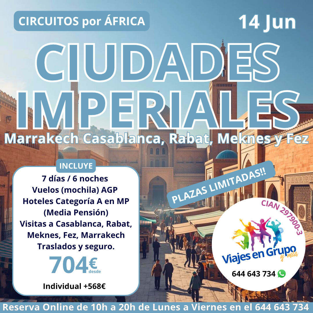 🌍✨ Ciudades Imperiales de Marruecos 🇲🇦 (Marrakech, Casablanca, Rabat, Meknes y Fez) 🏰 7 días / 6 noches desde 704€ 💸 con vuelos (mochila) ✈️ desde Málaga, hoteles categoría A en MP 🍽️🏨, visitas incluidas 🗺️, traslados y seguro 🛡️ (individual +568€) ❗ Plazas limitadas 🔥 📲 Reserva ya en 644 643 734 o en 👉 https://viajesengrupo.es/ciudades-imperiales #Marruecos #ViajesEnGrupo #Circuitos #OfertasViajes #Africa