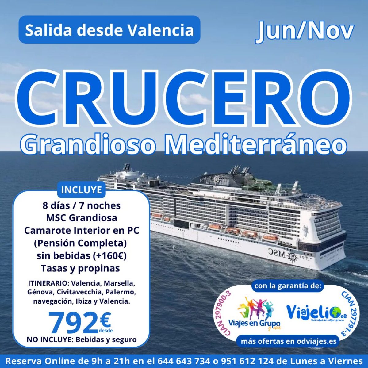 Jun/Nov, (8 días/ 7 noches) desde Valencia en MSC Grandiosa. Incluye: Camarote Interior 🍜 PC (Pensión Completa) sin Bebidas🍹(Easy +160€), Tasas 🎟 y propinas incluidas. (Seguro anulación 25€/persona). ITINERARIO: Valencia, Marsella, Génova, Civitavecchia, Palermo, navegación, Ibiza y Valencia. Precio desde 💶 792€.