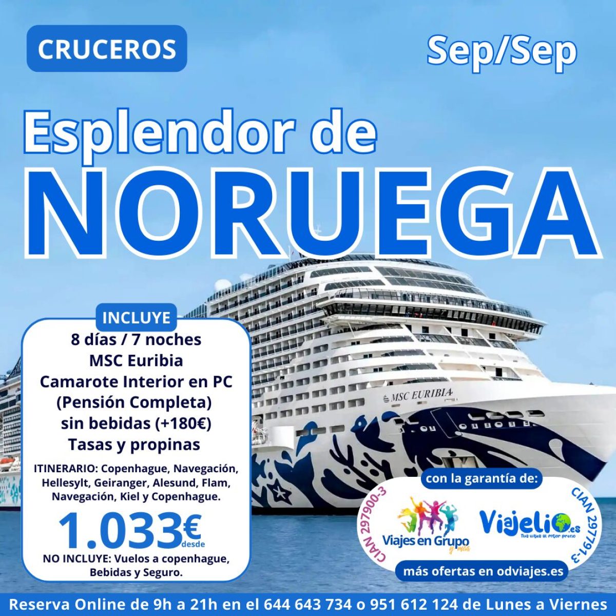 ESPLENDOR de NORUEGA 🛳️ desde Copenhague con vuelos desde Madrid, Barcelona, Valencia o Málaga de Septiembre de 2025 a Septiembre de 2026 (8 días/ 7 noches) en MSC Euribia. Incluye: Camarote Interior 🍜 PC (Pensión Completa), sin bebidas 🍹, tasas 🎟, vuelos 🛩️, traslados 🚌 y propinas. Precio desde 💶 1.033€. Bebidas +180€ (Easy). Mas info y reservas aquí 👉 https://viajelio.es/esplendordenoruega #fiordos #noruega #msc #cruceros #copenhague #madrid #valencia #malaga #barcelona #viajelio #travel