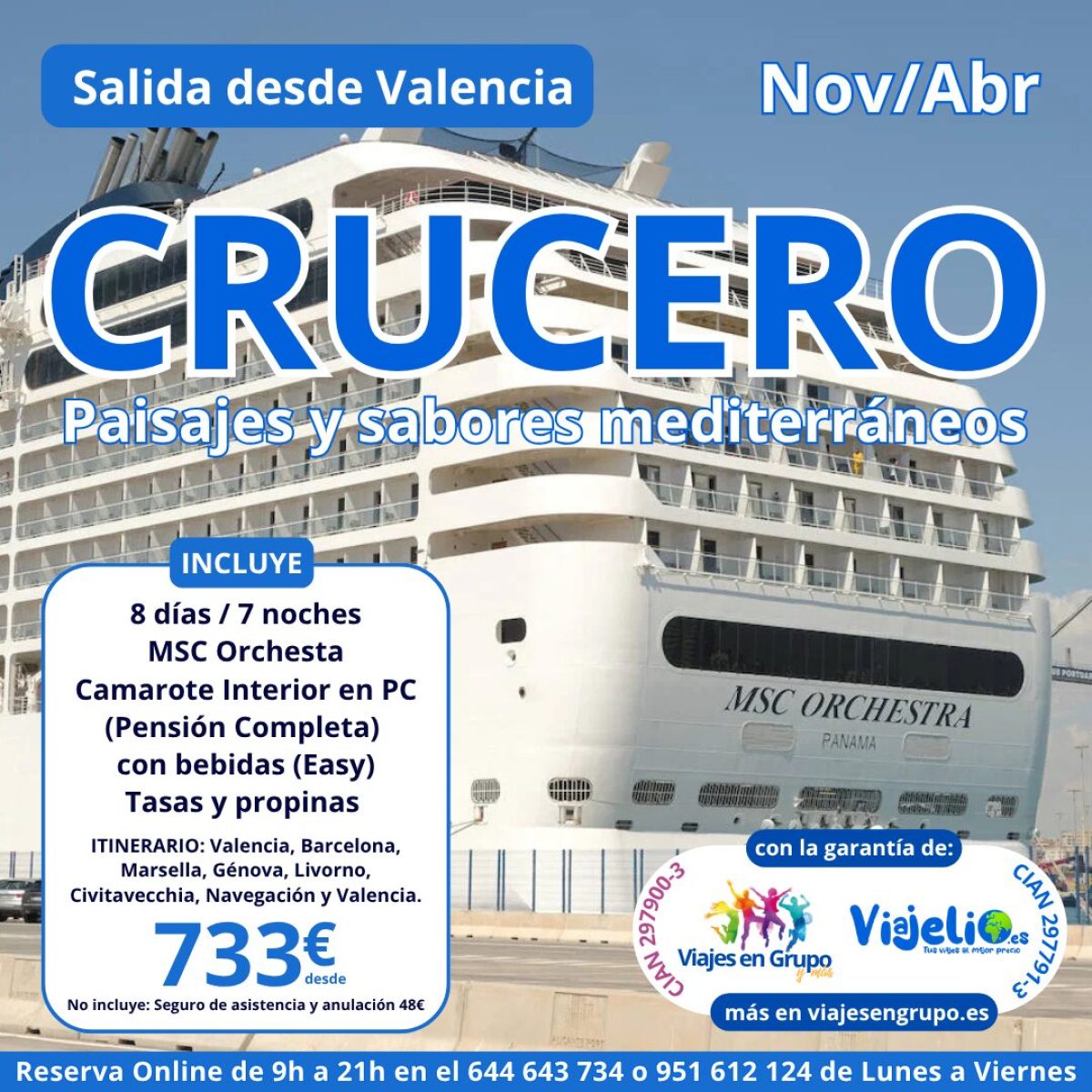 CRUCERO 🛳 desde Valencia (Paisajes y Sabores) de Noviembre a Abril (8 días/ 7 noches) en el MSC Orchesta. Incluye: Camarote Interior 🍜 PC (Pensión Completa) con Bebidas🍹(Easy), Tasas 🎟 y propinas incluidas. Itinerario: Valencia, Barcelona, Marsella, Génova, Livorno, Civitavecchia, navegación y Valencia. Precio desde 💶 733€. #crucero #valencia #malaga #viajelio #travel