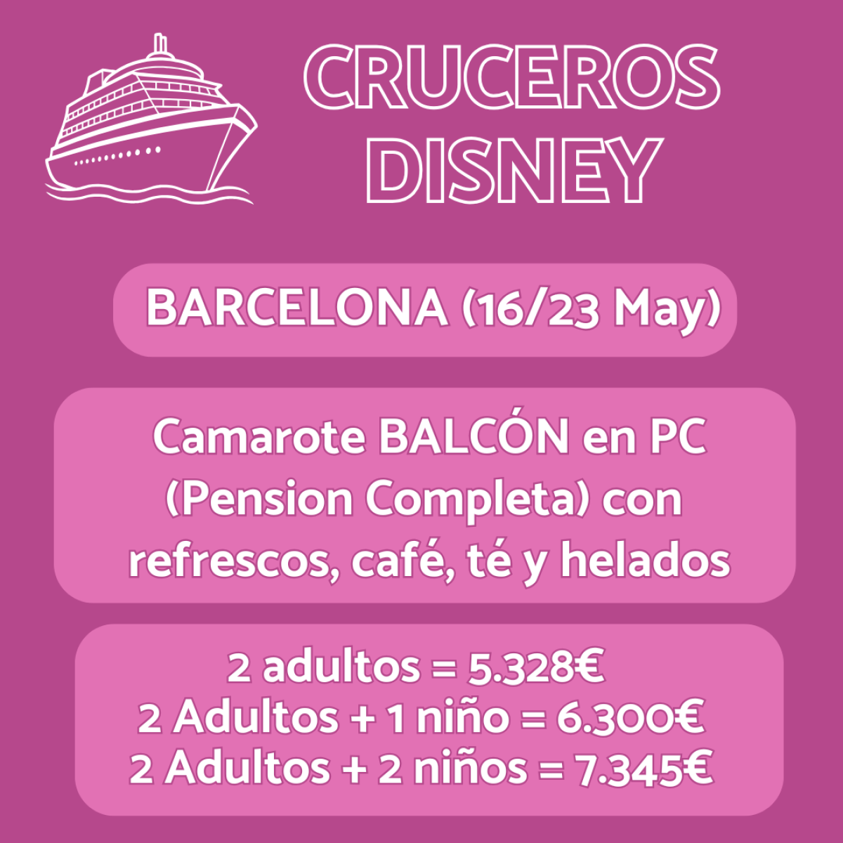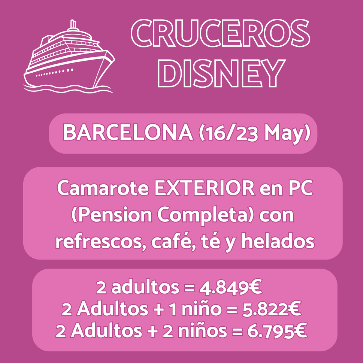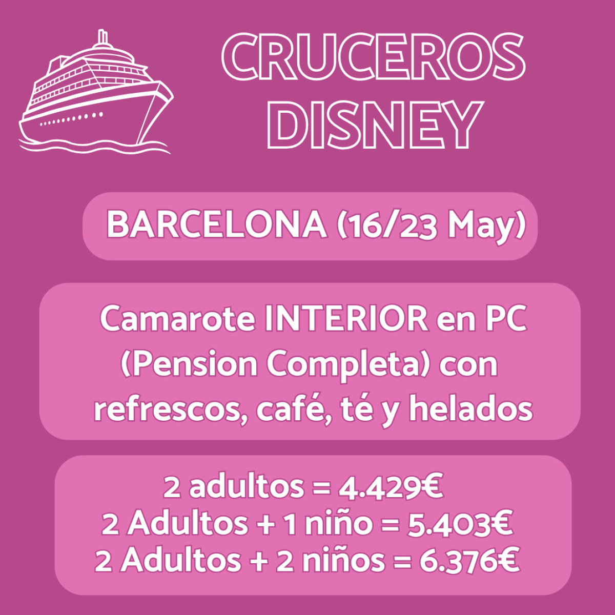 ⚓ zarpa hacia la magia con un Crucero Disney! 🚢✨ Viaje del 16 al 23 de mayo 🗓️ desde Barcelona en Camarote Interior con pensión completa 🍽️ incluyendo refrescos, café, té y helados 🍦 desde solo 4.849€. ¡Aventura, diversión y magia en alta mar! 🏰🌊
