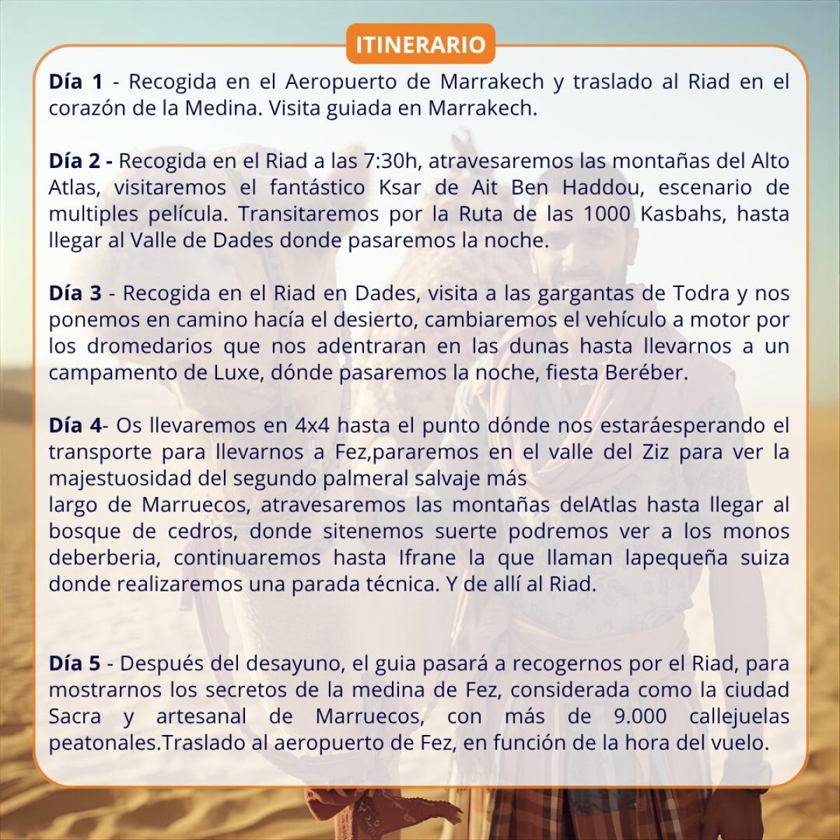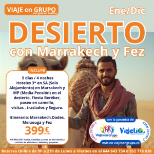 DESIERTO con MARRAKECH y FEZ 🐫 de Enero a Diciembre (viernes a Martes). Incluye: Hoteles 🏨 3* en SA (Solo Alojamiento) en Marrakech y MP (Media Pensión 🍛) en el desierto 🌵, Fiesta Beréber 🥳, paseo en camello 🐫, visitas con guía 🙋🏻♂️, traslados 🚐 y seguro de asistencia 🎫. No incluye: bebidas🍷 y propinas. Itinerario: Marrakech, Dades, Merzouga y Fez. precio 💶 399€/persona + vuelos. #marrakech #fez #desierto #malaga #viajesengrupo #viajelio #viajes #travel
