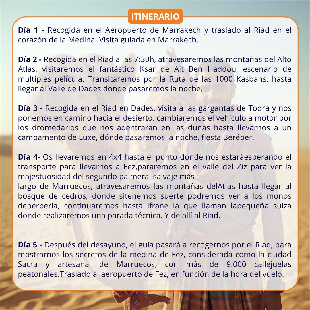 DESIERTO con MARRAKECH y FEZ 🐫 de Enero a Diciembre (viernes a Martes). Incluye: Hotel 🏨 3* en SA (Solo Alojamiento) en Marrakech y MP (Media Pensión 🍛) en el desierto 🌵, Fiesta Beréber 🥳, paseo en camello 🐫, visitas con guía 🙋🏻♂️, traslados 🚐 y seguro de asistencia 🎫. No incluye: bebidas🍷 y propinas. Itinerario: Marrakech, Dades, Merzouga y Fez. precio 💶 399€/persona + vuelos. #marrakech #fez #desierto #malaga #viajesengrupo #viajelio #viajes #travel