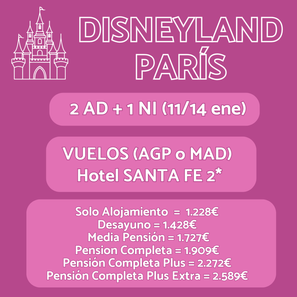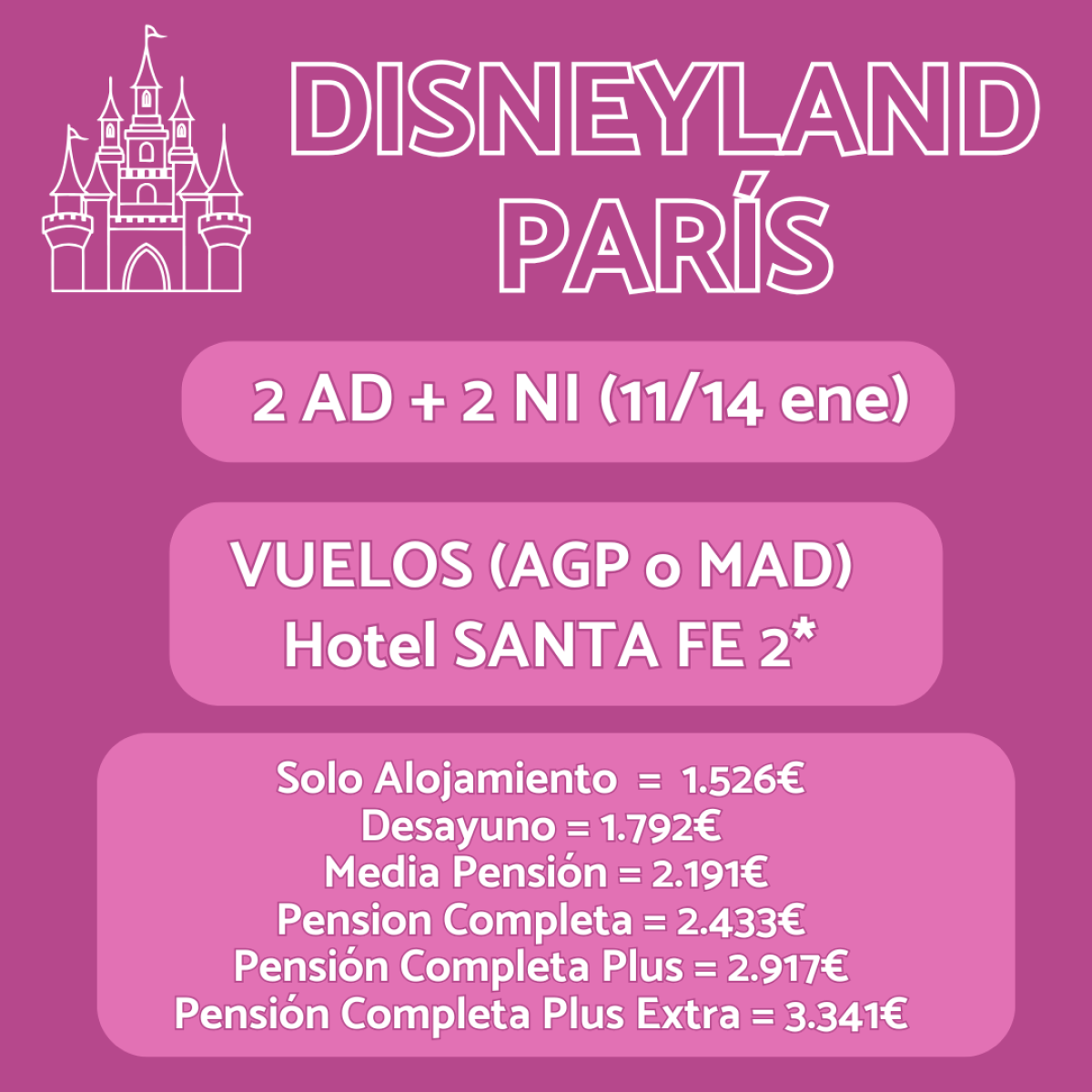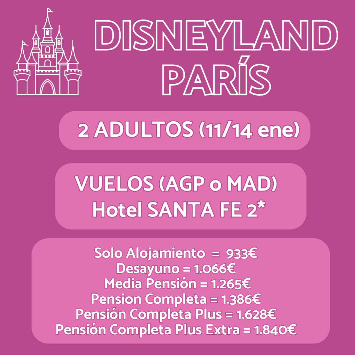 ✨ Vive la magia en Disneyland® Paris! 🎢✨ Paquete del 11 al 14 de septiembre 🗓️: vuelos desde Málaga o Madrid ✈️ + 3 noches en el Hotel Santa Fe 2* 🏨 desde solo 933€. ¡Sumérgete en la aventura y crea recuerdos inolvidables! 🏰💫 Reserva ahora: https://viajelio.es/whatsapp. #DisneylandParis #ViajeMágico 🐭🎉