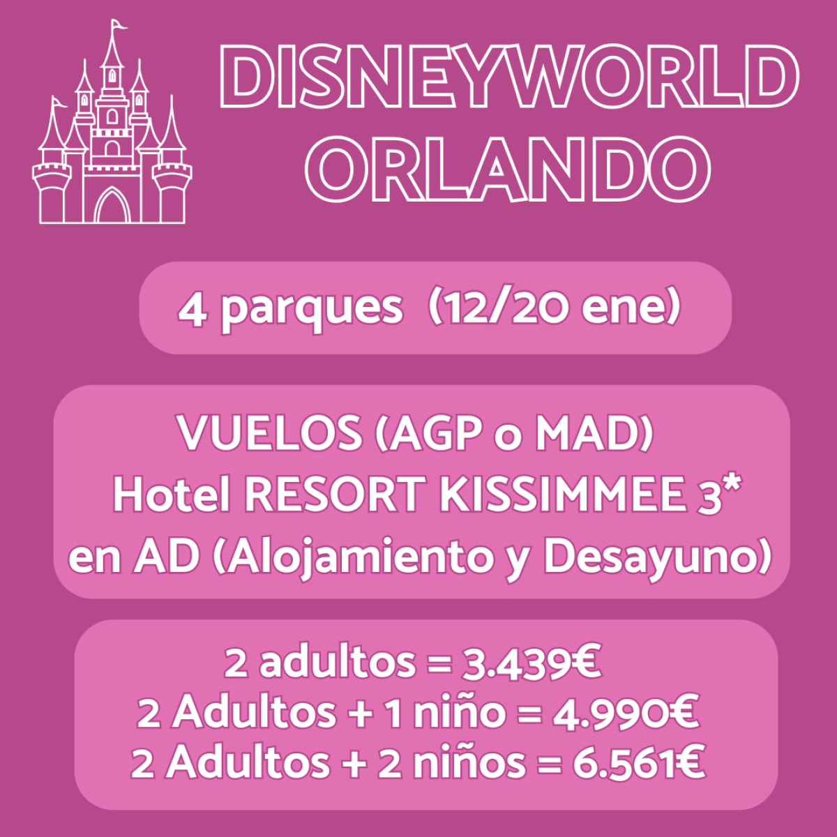 🌟 Escápate a la magia de Disneyworld Orlando! 🎢✨ Paquete del 12 al 29 de enero 🗓️: vuelos desde Málaga o Madrid ✈️ + hotel 3* en Kissimmee 🏨 desde solo 3.439€. ¡Vive aventuras épicas y momentos inolvidables! 🏰💫 Reserva ya: [enlace/contacto]. #DisneyWorld #ViajeMágico 🐭🎉