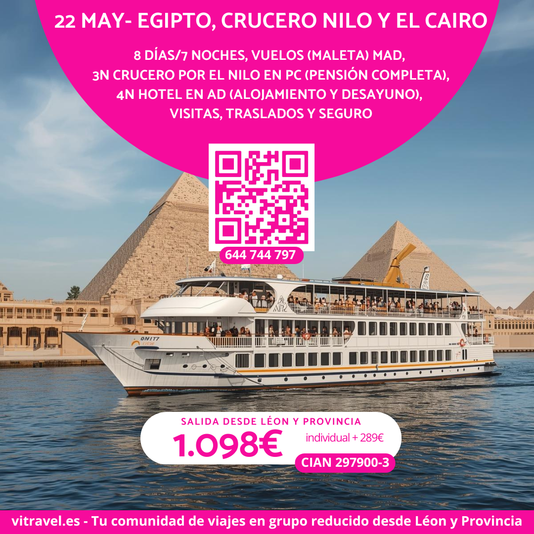 EGIPTO desde León 🇪🇬 (crucero por el Nilo 🚢 y El Cairo 🏙️) el 22 de Mayo 📅 (8 días/7 noches 🌙). Incluye: Vuelos ✈️ (maleta 🧳) MAD, 3N de Crucero en PC 🍽️ (Pensión Completa) sin bebidas 🚫🥤 y 4N Hotel A 🏨 en AD 🍳 (Alojamiento y Desayuno) en El Cairo, Visitas a templos de Edfu 🏛️ y Karnak 🏺, Valle de los Reyes 👑, Hatshepsut 🏯, Luxor 🌞, Necrópolis de Giza 🐫, Esfinge 🦁 y El Cairo 🏙️, Traslados 🚐 y Seguro 🛡️. Precio 💶 999€ (individual +289€). No incluye: Propinas 💸 90€ y visado 🛂 25€.
