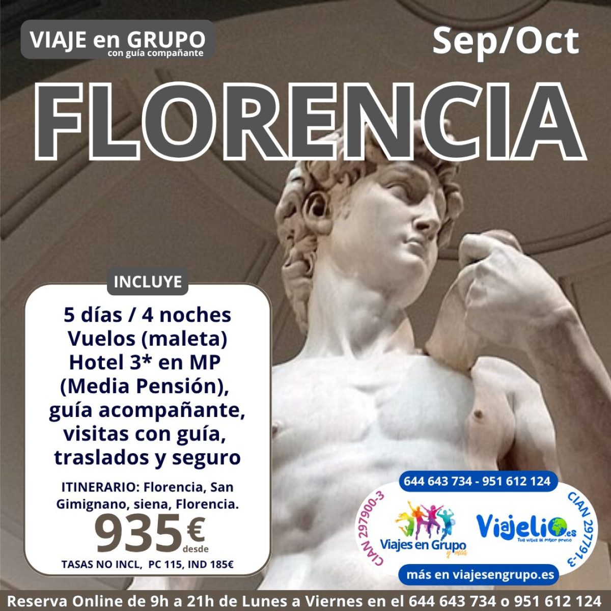 FLORENCIA 🍕 de Septiembre a Octubre (5 días/4 noches). Incluye: Vuelos 🛩 (maleta), Hotel 🏨 3 en MP (Media Pensión 🍝), guía acompañante 🙅♂️ y guía local, traslados 🚌 y seguro. Precio desde 💶 935€. . Más información y reserva aquí 👉 https:://viajesengrupo.es/whatsapp #florencia #italia #viajesengrupo #viajelio #travel