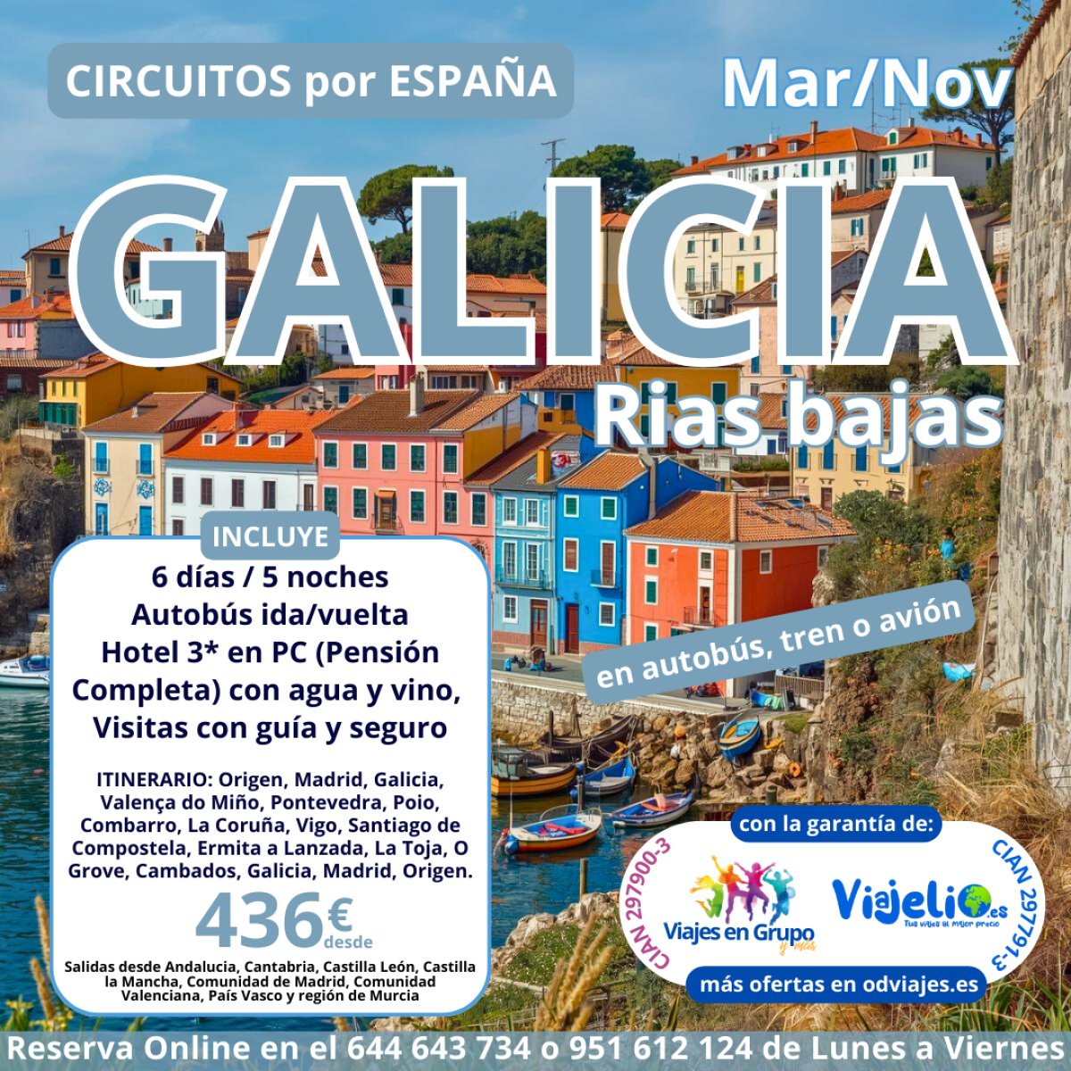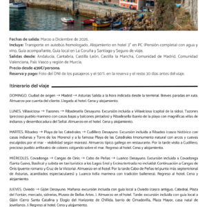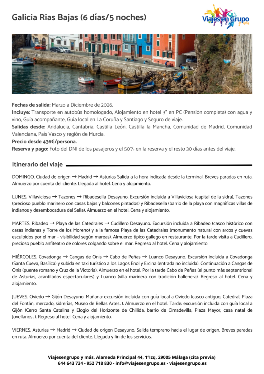 Galicia 🧙♀️ Rías bajas de Marzo a Diciembre (6 días/5 noches). Incluye: 🚌 Autobús 🚌, Hotel 🏨 3* en PC (Pensión Completa) con agua y vino 🍷, Visitas con guía 🌇 y seguro de viaje. Precio desde 💶 436€/persona.