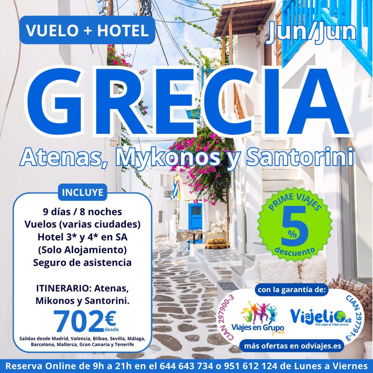 GRECIA 🏛️ de Junio a Junio (9 días/8 noches). Incluye: Vuelos 🛩️ (mochila 🎒), Hotel 🏨 3* y 4* en SA (Solo Alojamiento) y seguro. Precio 💶 desde 702€/persona. Reserva tu plaza antes que suba el precio aquí 👉 https://prime.viajelio.es/grecia #grecia #atenas #mykonos #santorini #madrid #valencia #bilbao #sevilla #malaga #barcelona #mallorca #grancanaria #tenrife #viajesengrupo #viajelio #viajes #travel #prime #primeviajes