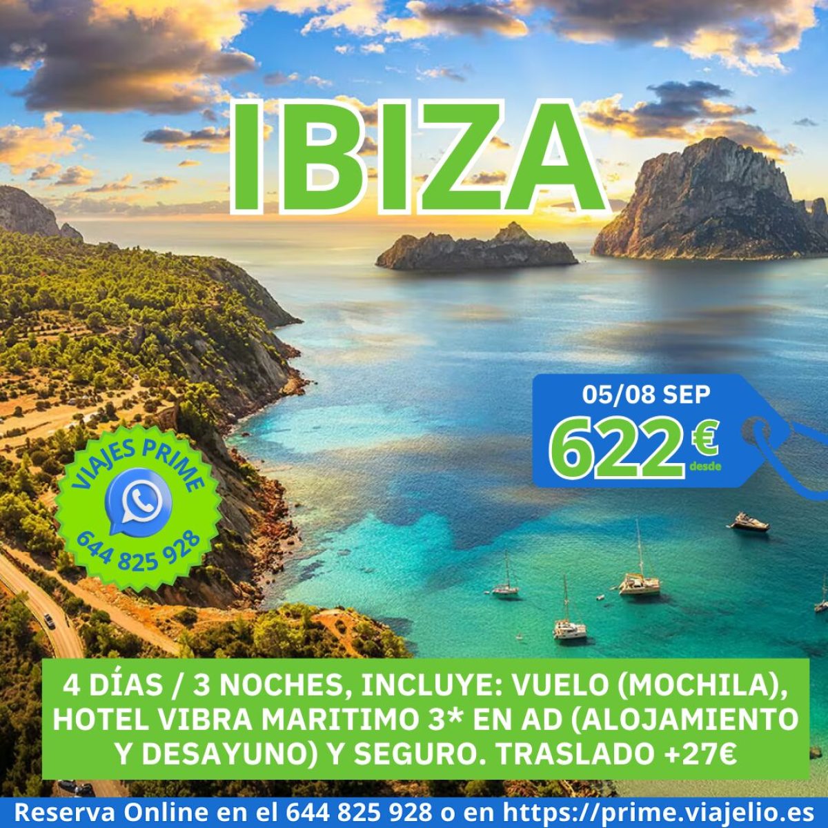 IBIZA del 5/8 de Septiembre (4 días/ 3 noches) desde Málaga. Incluye: Vuelo (mochila), Hotel 3* en AD (Alojamiento y Desayuno) y Seguro. Precio 622€/persona. Traslado +27€, haz tu reserva en https://prime.viajelio.es #ibiza #baleares #malaga #viajelio #prime #viajes