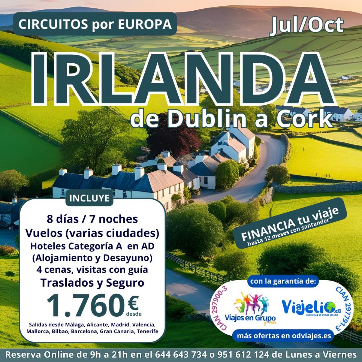 IRLANDA 🇮🇪 (De Dublin a Cork) 8 días/7 noches de Julio a Octubre. Incluye: Vuelos 🛩 (varias ciudades), Hoteles 🏨 Categoría A en AD (Alojamiento y Desayuno), 4 Cena, Visitas con guía 📷, traslados 🚌 y seguro 🎫. Precio desde 💶 1.760€. Info y Reservas 👉 https://viajesengrupo.es/irlanda #irlanda #dublin #cork #madrid #valencia, #bilbao #sevilla #malaga #barcelona, #mallorca #grancanaria #tenerife #viajesengrupo #viajelio #travel