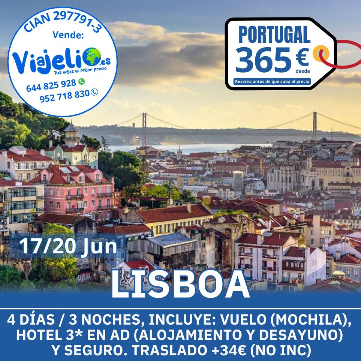 LISBOA 🚋 del 17/20 de Junio. Incluye: Vuelos 🛩️(mochila 🎒), Hotel 🏨 3* en AD (Alojamiento y Desayuno ☕) y seguro. Precio 💶 365€/persona. #lisboa #portugal #madrid #barcelona #malaga #valencia #viajesbaratos #viajelio #viajes #ofertas