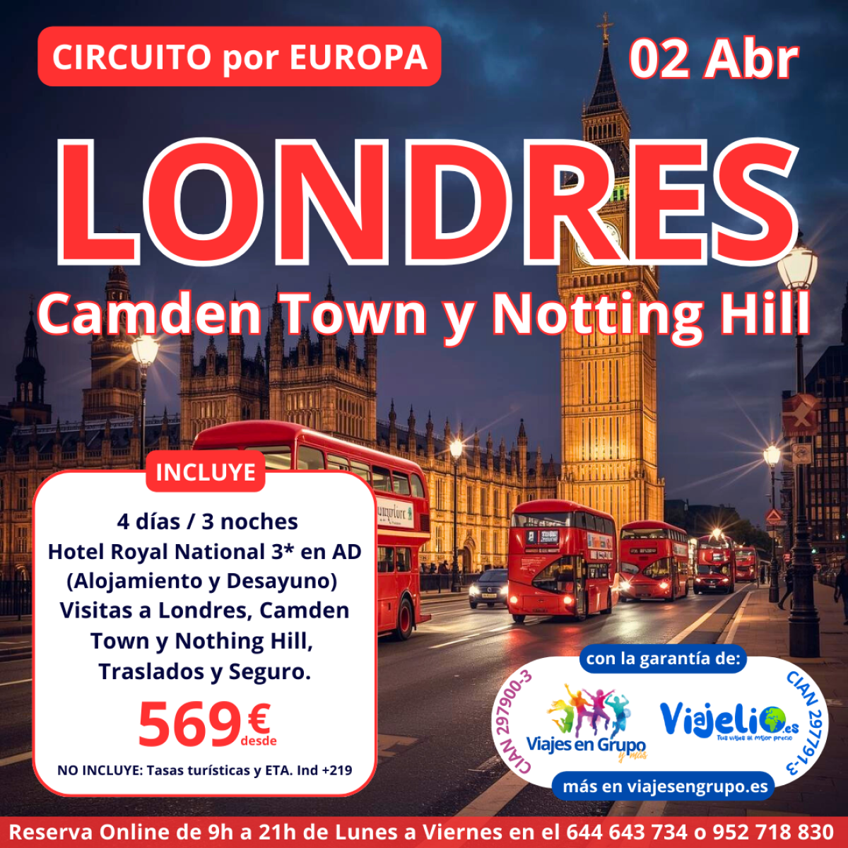 LONDRES del 2/5 de Abril. Incluye: Vuelo (mochila), Hotel Royal National 3* en AD (Alojamiento y Desayuno), Visitas a Londres, Camden Town y Nothin Hill, Traslados y Seguro. Precio 569€ (ind +219€)