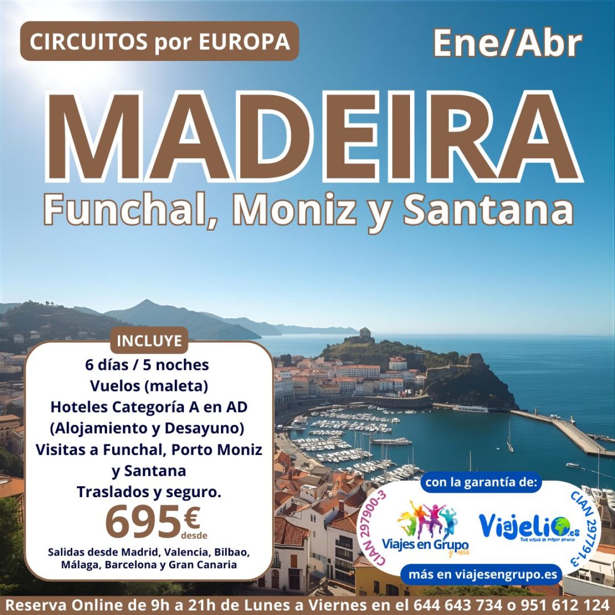 Ene/Abr (6 días/5 noches) desde Madrid, Valencia, Bilbao, Málaga, Barcelona y Gran Canaria. Incluye: Vuelo (maleta)🧳, Hoteles Categoría A en AD 🏨 (alojamiento y Desayuno🥐) 🍽️, Visitas a Funchal y Porto Moniz, Traslados🚐 y Seguro🛡️. precios desde 695€💥