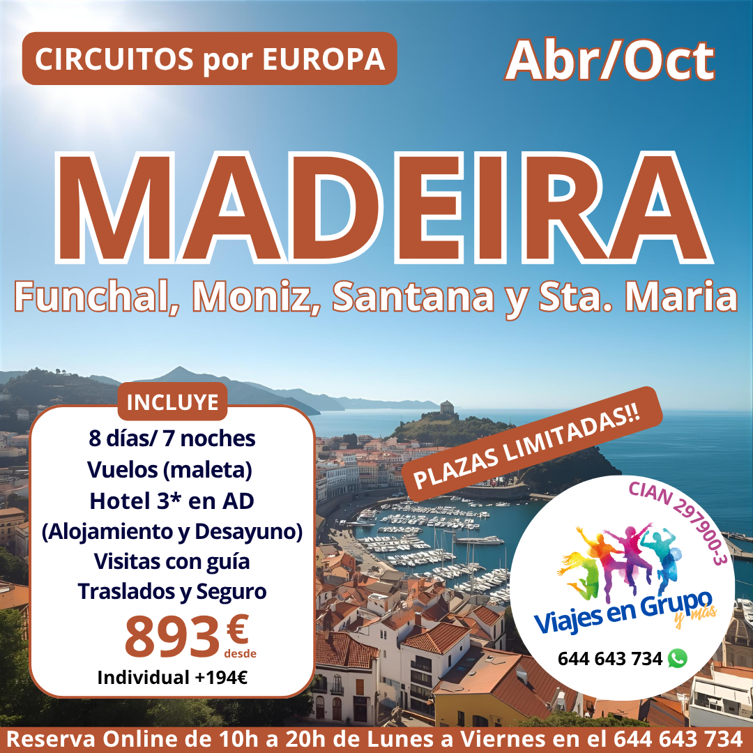 🌴🇵🇹✨ Circuito Madeira (Abr/Oct) 🏝️ Funchal, Moniz, Santana y Sta. María ✈️ 8 días/7 noches con vuelos (maleta) 🧳, hotel 3⭐ en AD 🍽️, visitas con guía 🗺️, traslados 🚐 y seguro 🛡️ desde 893€ 💸 (supl. individual +194€) 🔥 ¡PLAZAS LIMITADAS! 📲 Reserva ya en el 644 643 734 #ViajesEnGrupo #Madeira #ViajarPorEuropa #OfertasViajes #ChollosViajes