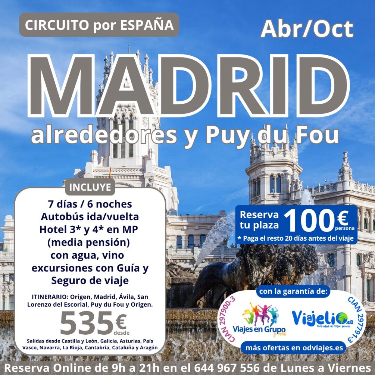 Madrid 🕍 alrededores y Puy du Fou de Abril a Octubre (7 días/6 noches). Incluye: 🚌 Autobús 🚌, 🏨 Hotel 3* y 4* en MP (Media Pensión) agua y vino 🍷, excursiones 🌇 con guía local 🙅♀️ y seguro de viaje. Precio desde 💶 535€/persona. Salidas desde Castilla y León, Galicia, Asturias, País Vasco, Navarra, La Rioja, Cantabria, Cataluña y Aragón.