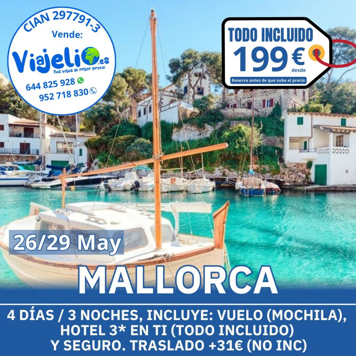 MALLORCA 🏖️ del 26/29 de Mayo. Incluye: Vuelos 🛩️(mochila 🎒), Hotel 🏨 3* en TI (Todo Incluido 🍝) y seguro. Precio 💶 desde 199€/persona. Reserva tu plaza antes que suba el precio aquí 👉 https://viajelio.es/mallorca #mallorca #baleares #malaga #mayo #viajesengrupo #viajelio #viajes #travel