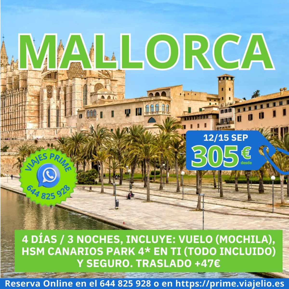 MALLORCA del 12/15 de Septiembre (4 días/ 3 noches) desde Málaga. Incluye: Vuelo (mochila), Hotel 4* en TI (Todo Incluido) y Seguro. Precio 305€/persona. Traslado +47€, haz tu reserva en https://prime.viajelio.es #mallorca #baleares #malaga #viajelio #prime #viajes