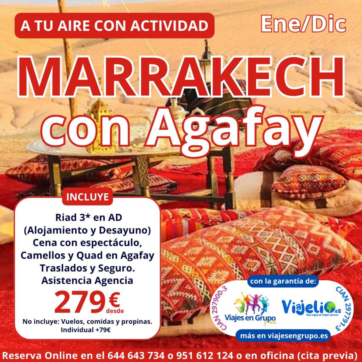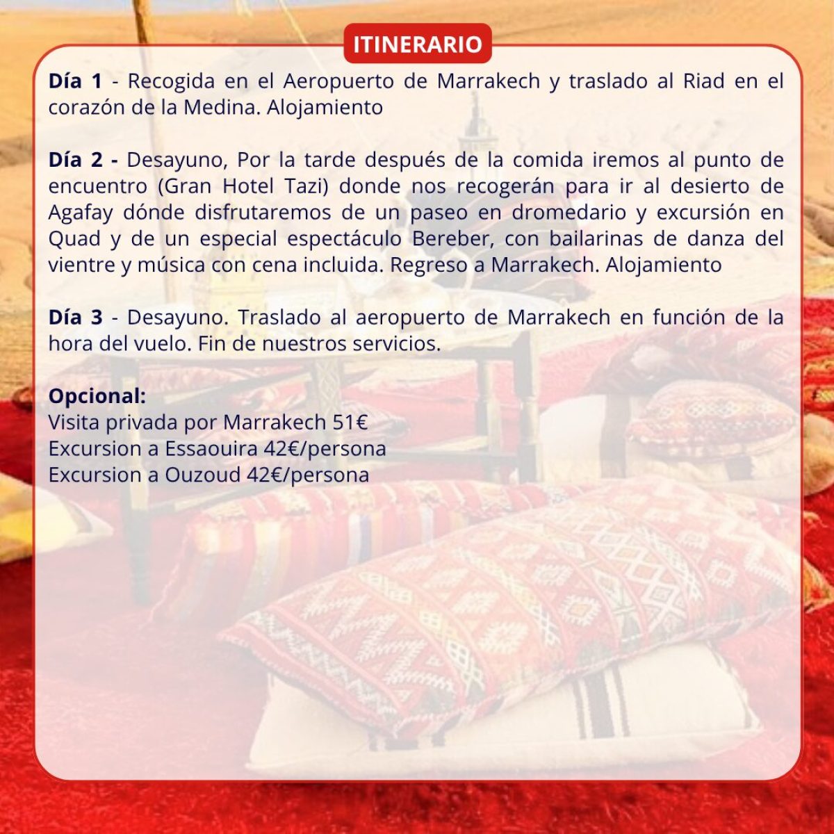 Ene/Dic desde varias ciudades. Incluye: Riad 🏨 3* en AD (Alojamiento y Desayuno), cena con espectáculo, camellos y Quad en Agafay, Traslados y Seguro. Precio desde 279€/persona. No incluye: Vuelos, Comidas y propinas. Individual +79€. #marrakech #agafay #desieto #viajesengrupo #viajes
