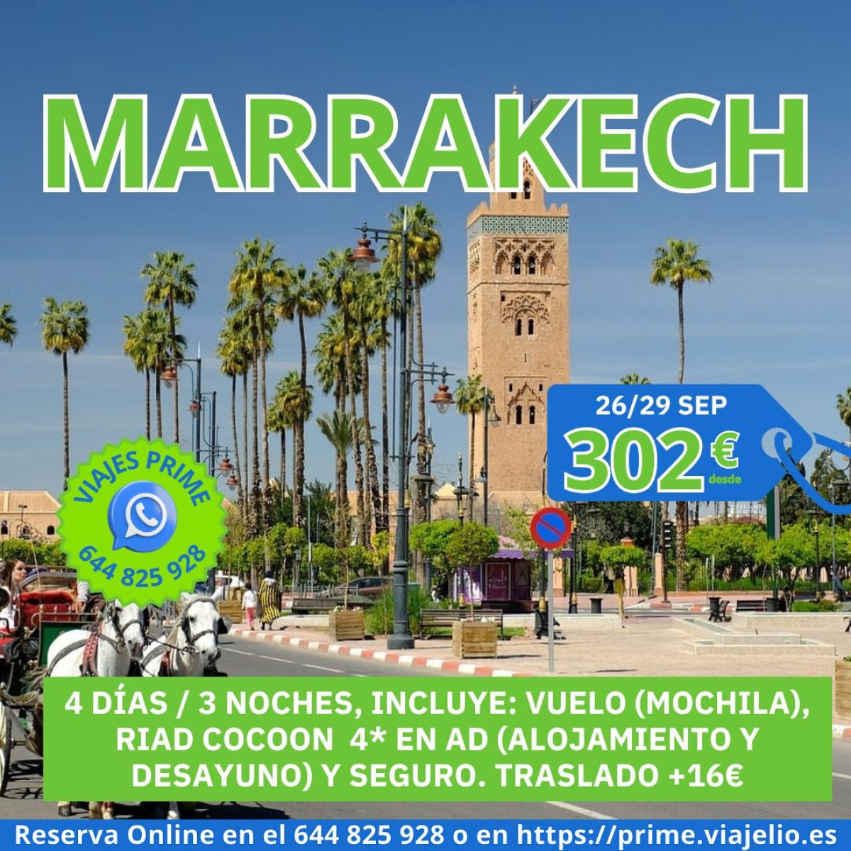 MARRAKECH del 26/29 de Septiembre (4 días/ 3 noches) desde Málaga. Incluye: Vuelo (mochila), Hotel 4* en AD (Alojamiento y Desayuno) y Seguro. Precio 302€/persona. Traslado +16€, haz tu reserva en https://prime.viajelio.es #marrakech #marruecos #malaga #viajelio #prime #viajes