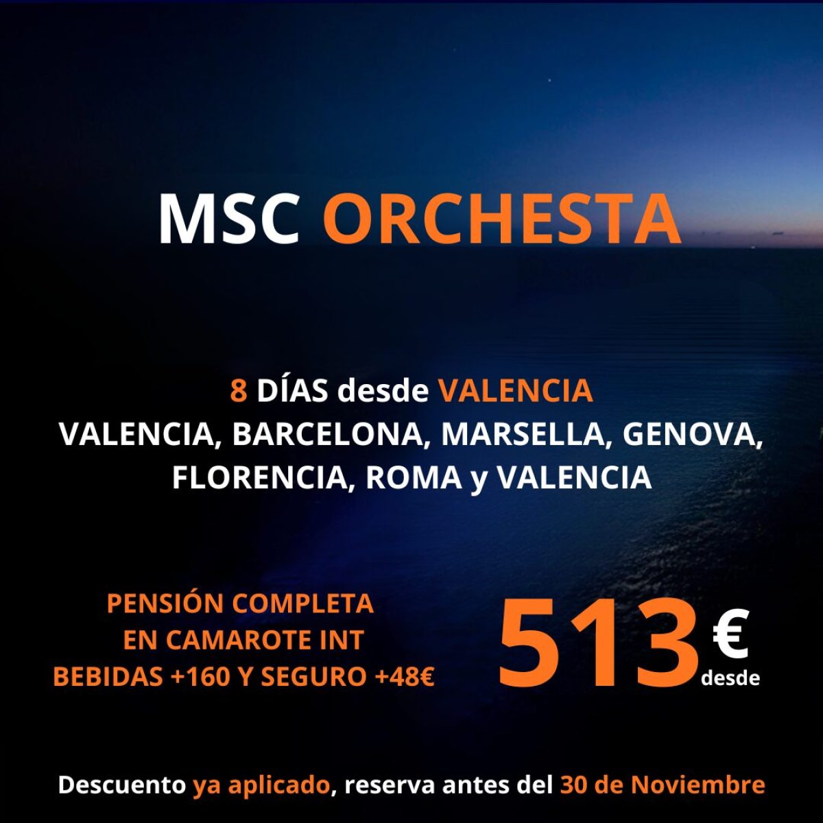 🚢 ¡MSC ORCHESTRA IMPERDIBLE! 🌅✨ 8 DÍAS desde VALENCIA 🛳️ Valencia ➡️ Barcelona ➡️ Marsella ➡️ Génova ➡️ Florencia ➡️ Roma ➡️ Valencia 🌍 🍽️ PENSIÓN COMPLETA en Camarote Interior 🍹 Bebidas +160€ 🛡️ Seguro +48€ 💥 ¡SOLO 513€ desde! ⚡ DESCUENTO YA APLICADO ⏳ ¡RESERVA ANTES del 30 NOV! 🔔 ¡Últimas plazas! Reserva YA 🔥 #CruceroOrchestra #Oferta513 #CruceroValencia #Italia8Dias #MSCOfertas #ViajesItalia #BlackFridayCruceros #VacacionesMediterraneo
