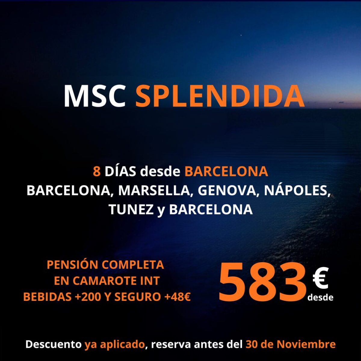 🚢 ¡MSC SPLENDIDA DE LUJO! 🌅✨ 8 DÍAS desde BARCELONA 🛳️ Barcelona ➡️ Marsella ➡️ Génova ➡️ Nápoles ➡️ Túnez ➡️ Barcelona 🌍 🍽️ PENSIÓN COMPLETA en Camarote Interior 🍹 Bebidas +200€ 🛡️ Seguro +48€ 💥 ¡SOLO 583€ desde! ⚡ DESCUENTO YA APLICADO ⏳ ¡RESERVA ANTES del 30 NOV! 🔔 ¡Plazas limitadissime! Reserva ORA 🔥 #CruceroSplendida #Oferta583 #CruceroBarcelona #Mediterraneo8Giorni #MSCOfertas #ViaggiItalia #BlackFridayCrociere #VacanzeMare