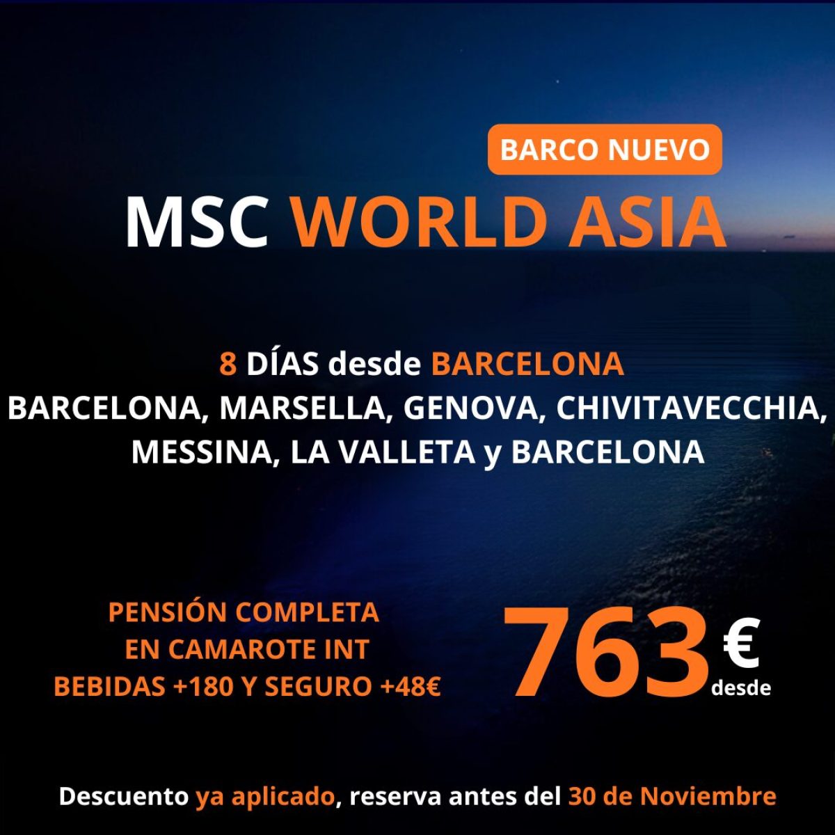 🚢 ¡NUEVO MSC WORLD ASIA! 🌅✨ 8 DÍAS desde BARCELONA 🛳️ Barcelona ➡️ Marsella ➡️ Génova ➡️ Civitavecchia ➡️ Messina ➡️ La Valletta ➡️ Barcelona 🌍 🍽️ PENSIÓN COMPLETA en Camarote Interior 🍹 Bebidas +180€ 🛡️ Seguro +48€ 💥 ¡SOLO 763€ desde! ⚡ DESCUENTO YA APLICADO ⏳ ¡RESERVA ANTES del 30 NOV! 🔔 ¡Plazas limitadas! Reserva YA 🔥 #CruceroWorldAsia #Oferta763 #CruceroBarcelona #Mediterraneo8Dias #MSCOfertas #BarcoNuevo #BlackFridayCruceros #VacacionesMalta
