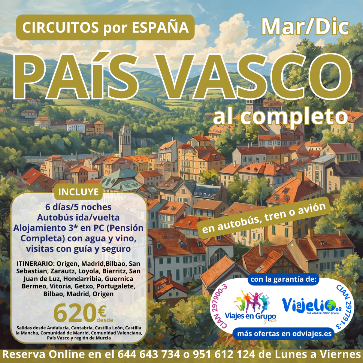 PAÍS VASCO 🏔️ de Marzo a Noviembre. Incluye: 🚌 Autobús, 🏨 Hotel 3* en PC (pensión Completa) agua y vino 🍷, Visitas con guía 🌇 y seguro de viaje. Precio desde 💶 620€/persona. Salidas desde Andalucía, Cantabria, Castilla León, Castilla la Mancha, Comunidad de Madrid, Comunidad Valenciana, País Vasco y región de Murcia. #paisvasco #malaga #circuitos #viajesengrupo #viajes #Ofertas