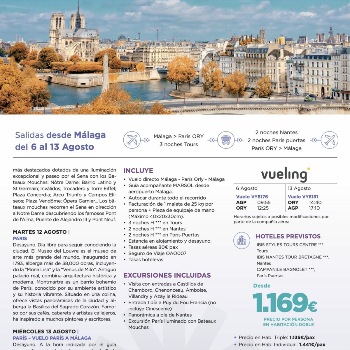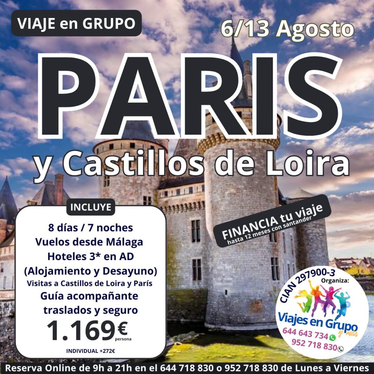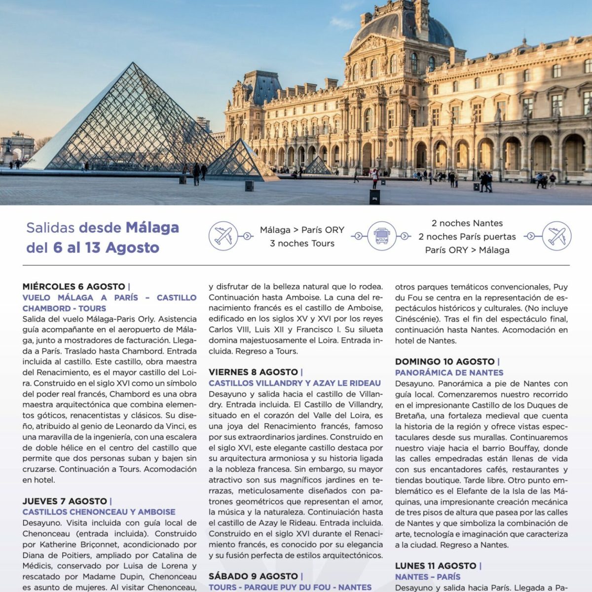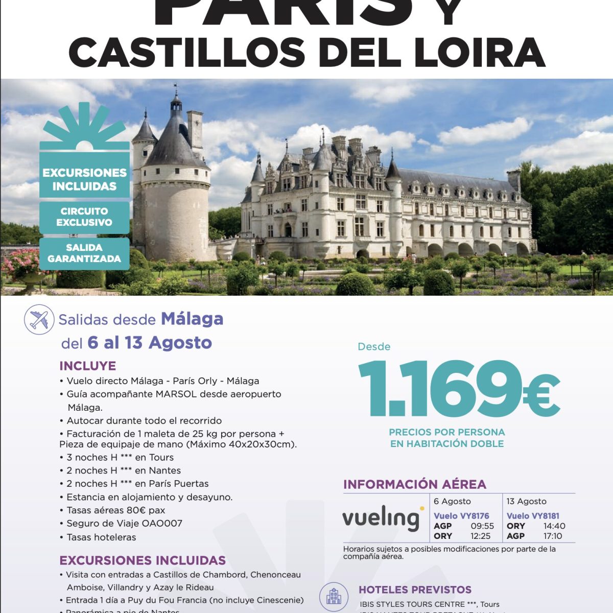 PARIS y CASTILLOS de LOIRA 🏰 desde Málaga del 6/13 de Agosto. Incluye: Vuelos 🛩 (maleta), Hoteles 🏨 3* en AD (Alojamiento y Desayuno ☕), Visitas a Castillos de Loira y París 📷, Guía 🙅♂️ acompañante, traslados 🚌 y seguro 🎫. Precio 1.169€. Individual +236€ #francia #paris #castillosdeloira #agosto #malaga #viajesengrupo #viajes #ofertas