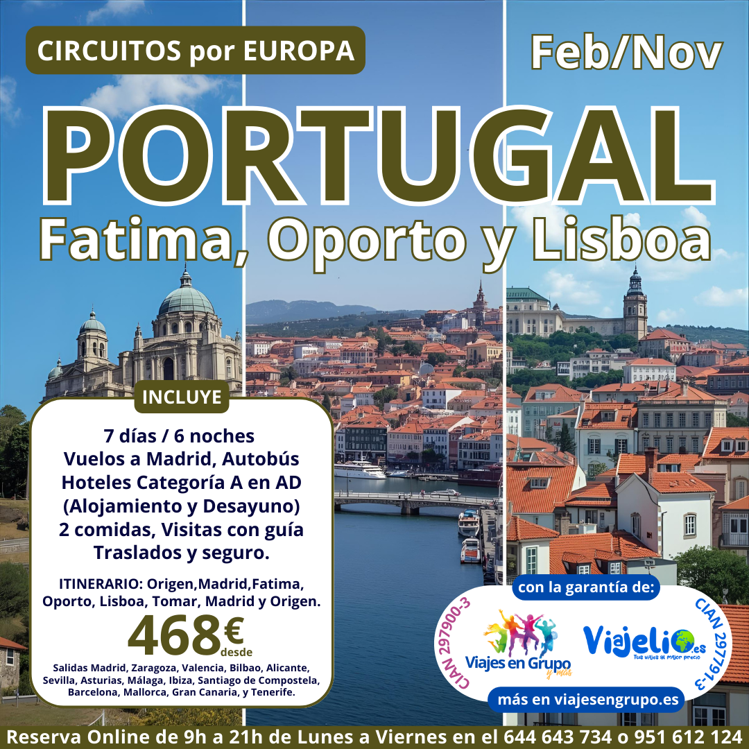 🚌🏨 Feb/Nov (7 días/6 noches) desde Madrid, Zaragoza, Valencia, Bilbao, Alicante, Sevilla, Asturias, Málaga, Ibiza, Santiago, Barcelona, Mallorca, Gran Canaria y Tenerife ✈️🍳🙏🍷🏰 Incluye: vuelo, bus, hoteles A en AD, 2 comidas, visitas Fátima-Oporto-Lisboa, 🚐 traslados y 🛡️ seguro | 💰 desde 468€ #ViajesEuropa #TourPortugal #FátimaOportoLisboa #Escapada2026 #ViajarEnGrupo