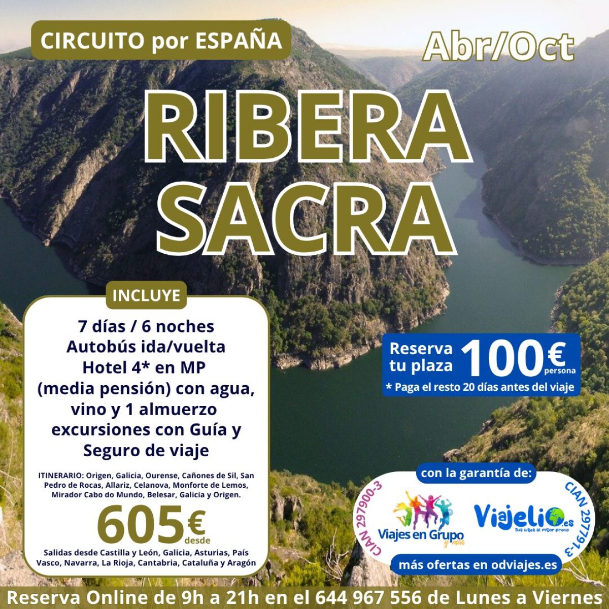 Ribera Sacra ⛰️ de Abril a Octubre (7 días/6 noches). Incluye: 🚌 Autobús 🚌, Hotel 🏨 3* y 4* en MP (Media Pensión) agua y vino 🍷, 1 almuerzo, excursiones 🌇 con guía local 🙅♀️ y seguro de viaje. Precio desde 💶 605€/persona. Salidas desde Castilla y León, Galicia, Asturias, País Vasco, Navarra, La Rioja, Cantabria, Cataluña y Aragón.