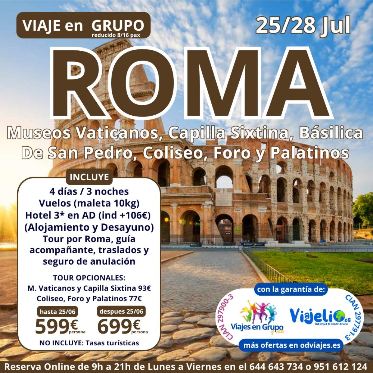 ROMA 🏛️ en grupo reducido (8/16 pax) desde Málaga del 25/28 de Julio (4 días / 3noches). Incluye: Vuelo 🛩️ (maleta 🧳), 🏨 Hotel 3* en AD (Alojamiento y Desayuno ☕) individual +106€, Tour por Roma, Traslados 🚌 y Seguro de anulación 🛡️. Precio 💶 599€ (hasta 25/06). Tour opcionales: Museos vaticanos y Capilla Sixtina 93€, Coliseo, Foro y Palatinos 77€. Información y reservas aquí 👉 https://viajesengrupo.es/whatsapp #roma #italia #viajesengrupo #malaga #viajes #travel