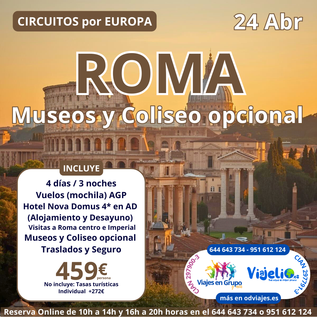 ROMA (museo y Coliseo opcional) el 24 Abril (4 días/3 noches). Incluye: Vuelo (maleta), Hotel Nova Domus 4* en AD (alojamiento y Desayuno), Visitas a Roma Centro e Imperial, Traslados y Seguro. Precio 459€/persona