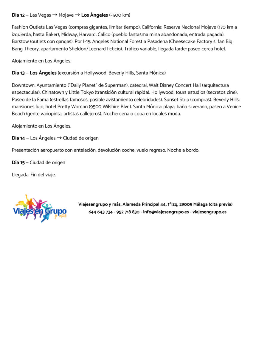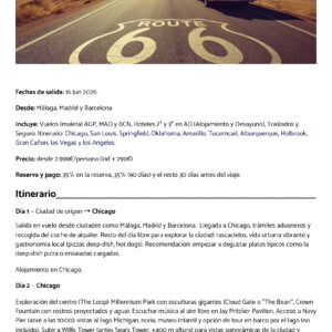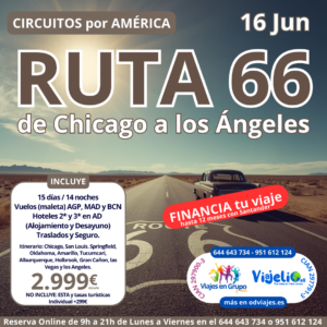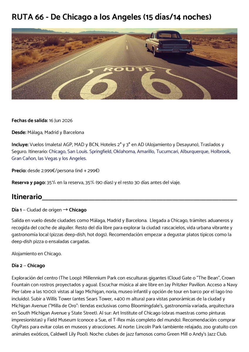 RUTA 66 🛣(De Chicago a los Angeles) el 14 de Junio (15 días/14 noches). Incluye: Vuelos 🛩️ (maleta 🧳) AGP, MAD y BCN, hoteles 🏨 2*, 3* de Chicago a Los Angeles en AD (Alojamiento y Desayuno), traslados 🚘 y seguro 🛡️. Itinerario: Itinerario: Chicago, San Louis, Springfield, Oklahoma, Amarillo, Tucumcari, Alburquerque, Holbrook, Gran Cañón, Las Vegas y Los Angeles. Precio 💶 2.999€. (Individual +299€), no incluye: ESTA y tasas turísticas.