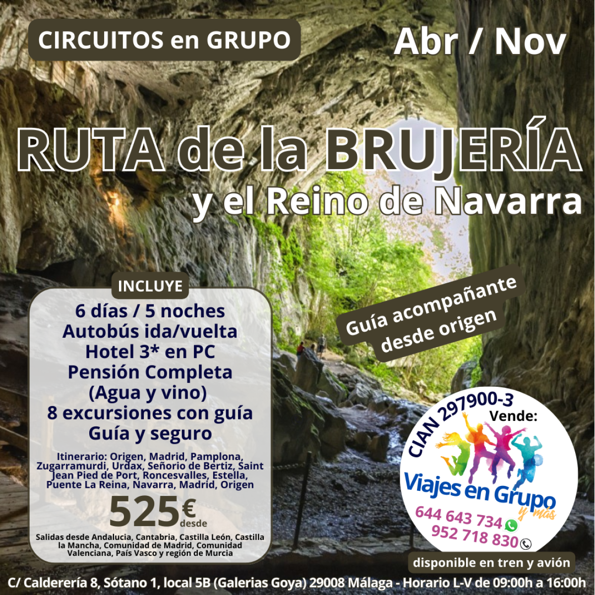 Ruta de la brujería 🧙♀️ de Abril a Noviembre. Incluye: 🚌 Autobús, 🏨 Hotel 3* en PC (pensión Completa) agua y vino 🍷, 8 excursiones 🌇, guía local 🙅♀️ y seguro de viaje. Precio desde 💶 525€/persona. Salidas desde Andalucía, Cantabria, Castilla León, Castilla la Mancha, Comunidad de Madrid, Comunidad Valenciana, País Vasco y región de Murcia. #navarra #malaga #circuitos #viajesengrupo #viajes #Oferta