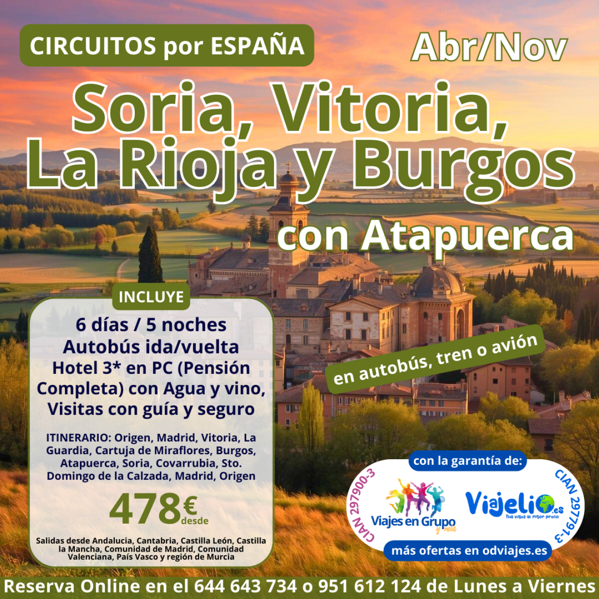 Soria, Vitoria, La Rioja y Burgos de Abril a Noviembre. Incluye: Autobús,