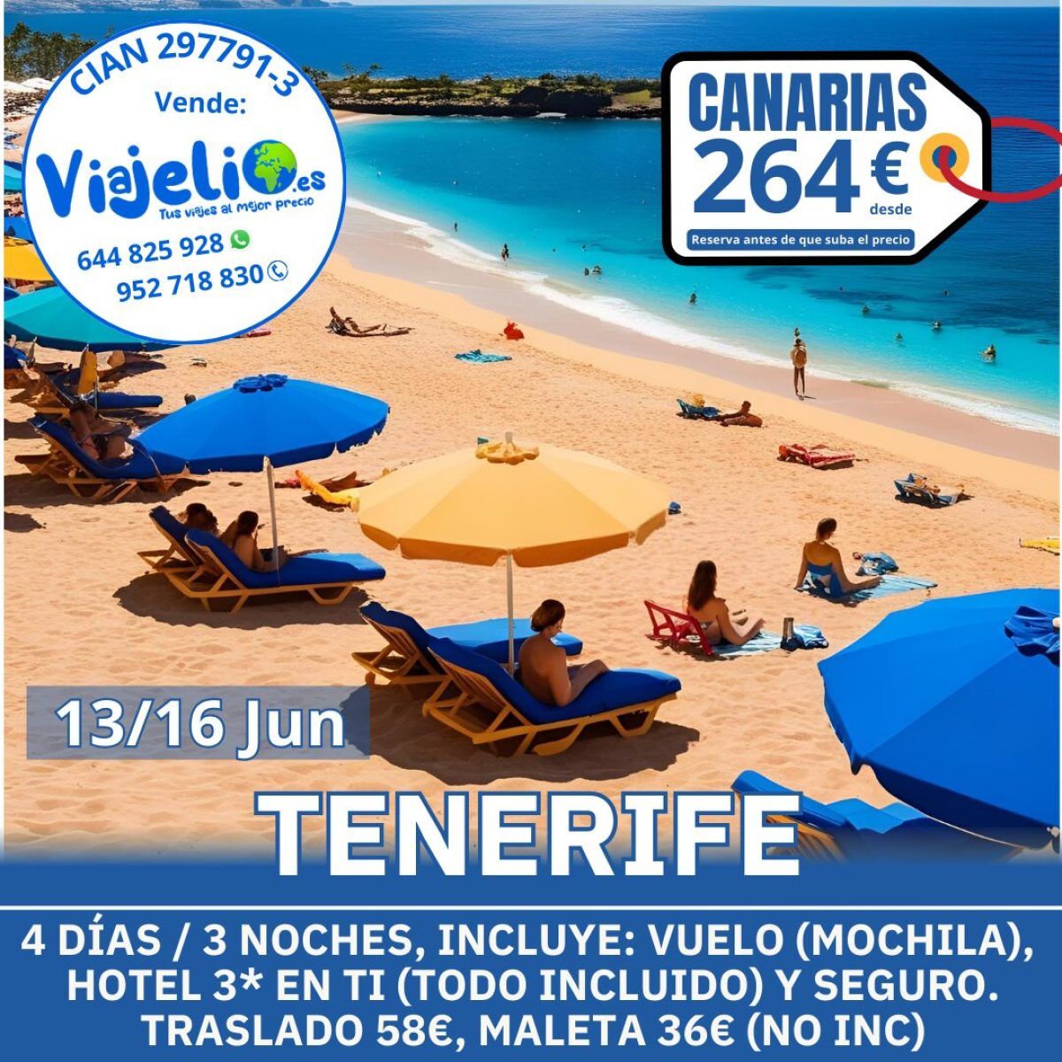 TENERIFE 🏖️ del 13/16 de Junio. Incluye: Vuelos 🛩️(mochila 🎒), Hotel 🏨 3* en TI (Todo Incluido 🍝) y seguro. Precio 💶 desde 264€/persona. Reserva tu plaza antes que suba el precio aquí 👉 https://viajelio.es/tenerife #tenerife #canarias #malaga #junio #viajesengrupo #viajelio #viajes #travel