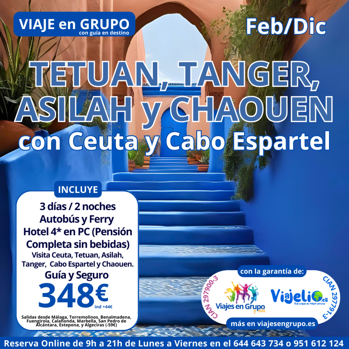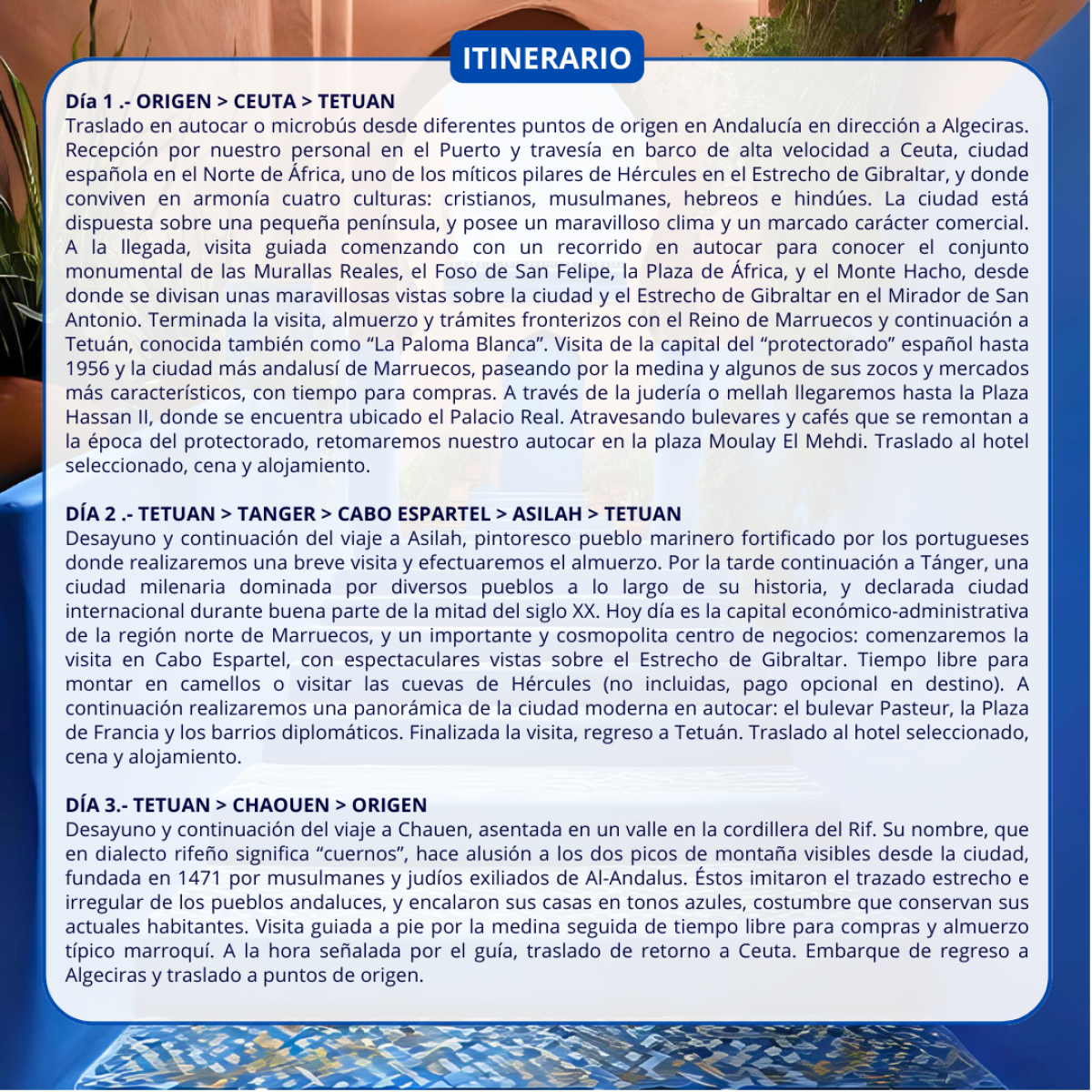 TETUAN, TANGER, ASILAH y CHAOUEN 🕌 de Febrero a Diciembre. Incluye: 🚌 Autobús desde Málaga y Costa del Sol, 🛳 Ferry, 🏨 Hotel 4* en PC (Pensión completa 🍵, sin bebidas 🍷), 🌇 visita a Ceuta, Tetuan, Tanger, Cabo Espartel, asilah y Chaouen con guía local, Guía 🙅♂️ acompañante y Seguro de asistencia. Precio 348€/persona. Salidas desde Málaga, Torremolinos, Benalmadena, Fuengirola, Calahonda, Marbella, San Pedro de Alcántara, Estepona y Algeciras.
