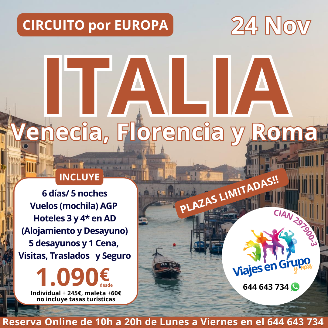 ✨ Italia 🇮🇹 (Venecia, Florencia y Roma) 🏰 6 días / 5 noches desde 1.090€ 💸 con vuelos (mochila) ✈️ desde Málaga, hoteles 3⭐ y 4⭐ en AD 🏨🍽️, 5 desayunos ☕ + 1 cena 🍴, visitas 🗺️, traslados y seguro 🛡️ (individual +245€, maleta +60€, tasas no incluidas) ❗ Plazas limitadas 🔥 📲 Reserva ya en 644 643 734 o en 👉 https://viajesengrupo.es/venecia-florencia-y-roma #Italia #ViajesEnGrupo #Europa #OfertasViajes #Escapadas