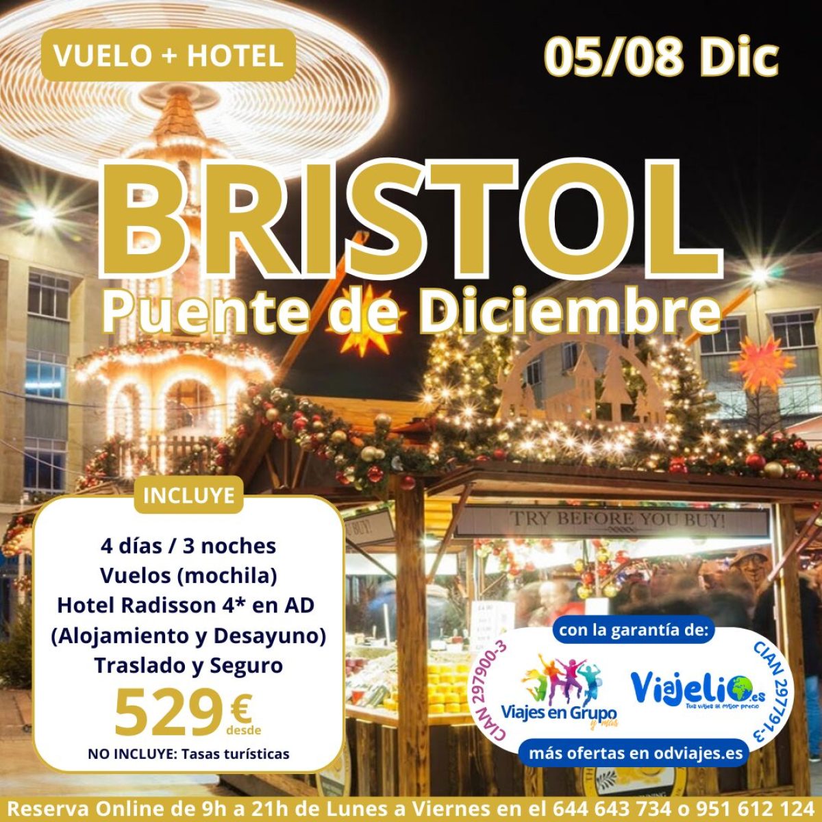 Viajar a Bristol del 5/8 Dic, (4 días/3 noches). Incluye: Vuelos desde Málaga (mochila), Hotel Radisson 4* en AD (Alojamiento y Desayuno), Traslado y Seguro. Precio desde 529€/persona.