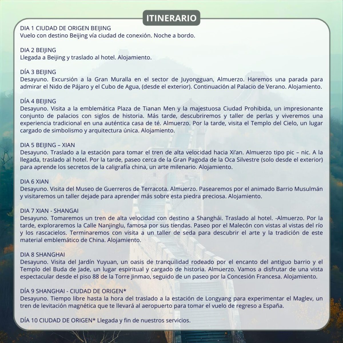 VIAJE a CHINA ⛩️ el 5 de Noviembre (10 días/ 9 noches). Incluye: Vuelos 🛩 (maleta), Hoteles 🏨 3* y 4* en AD (Alojamiento y Desayuno ☕), 6 almuerzos 🍝, Visitas 🌇 a Beijing, Xian y Shangai, Guía 🙅♂️acompañante, traslados 🚌 y seguro asistencia y anulación. Precio 2.349€. No Incluye: Bebidas, propinas y cualquier cosa no indicada. Individual 239€ #china #beijing #xian #shangai #viajesengrupo #viajes