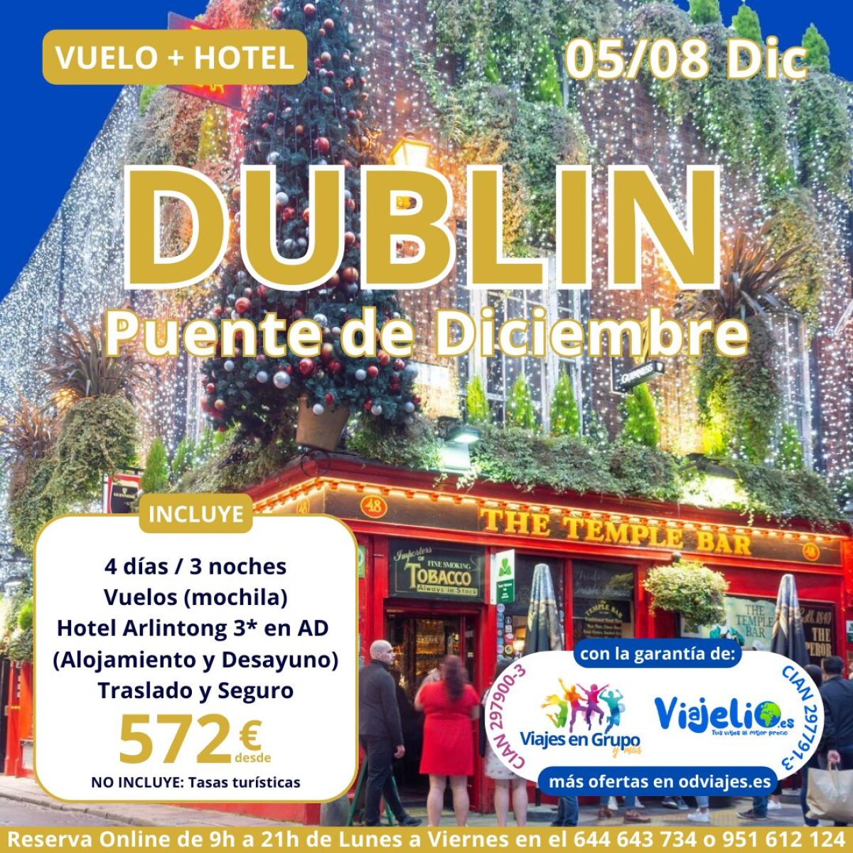 Viaje a Dublin del 5/8 Dic, (4 días/3 noches). Incluye: Vuelos desde Málaga (mochila), Hotel Arlintong 3* en AD (Alojamiento y Desayuno), Traslado y Seguro. Precio desde 572€/persona.
