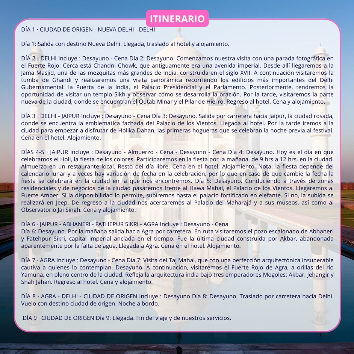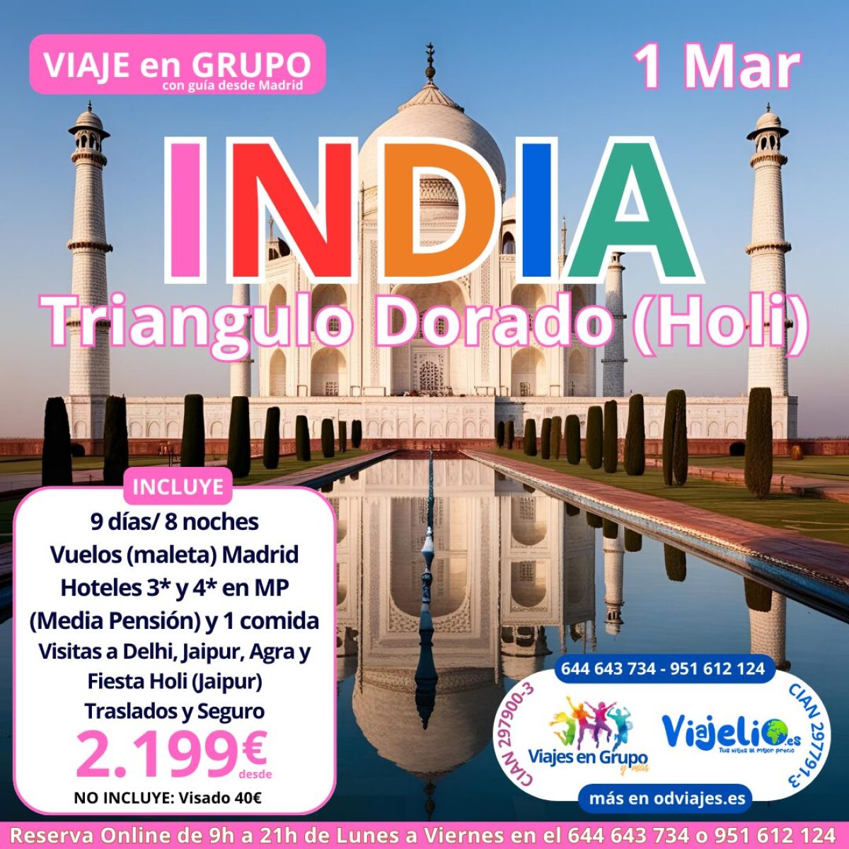 Viaje a la INDIA (Holi) el 01 Marzo, (9 días/8 noches) con guía desde Madrid. Incluye: Vuelos (maleta), Hoteles 3* y 4* en MP (Media Pensión) y 1 comida, Visitas a Dlehi, Jaipur, Agra y Fiesta Holi (Jaipur), traslados y Seguro. Precio desde 2.199€/persona. #india #asia #viajesengrupo #