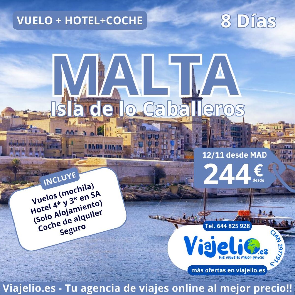 Viaje a Malta (8 días). Incluye: Vuelos (mochila), Hotel 4* y 3* en SA (Solo Alojamiento), Coche de alquiler y Seguro. Precio desde 244€/persona. Más info y reserva en https://viajelio.es/isladeloscaballeros